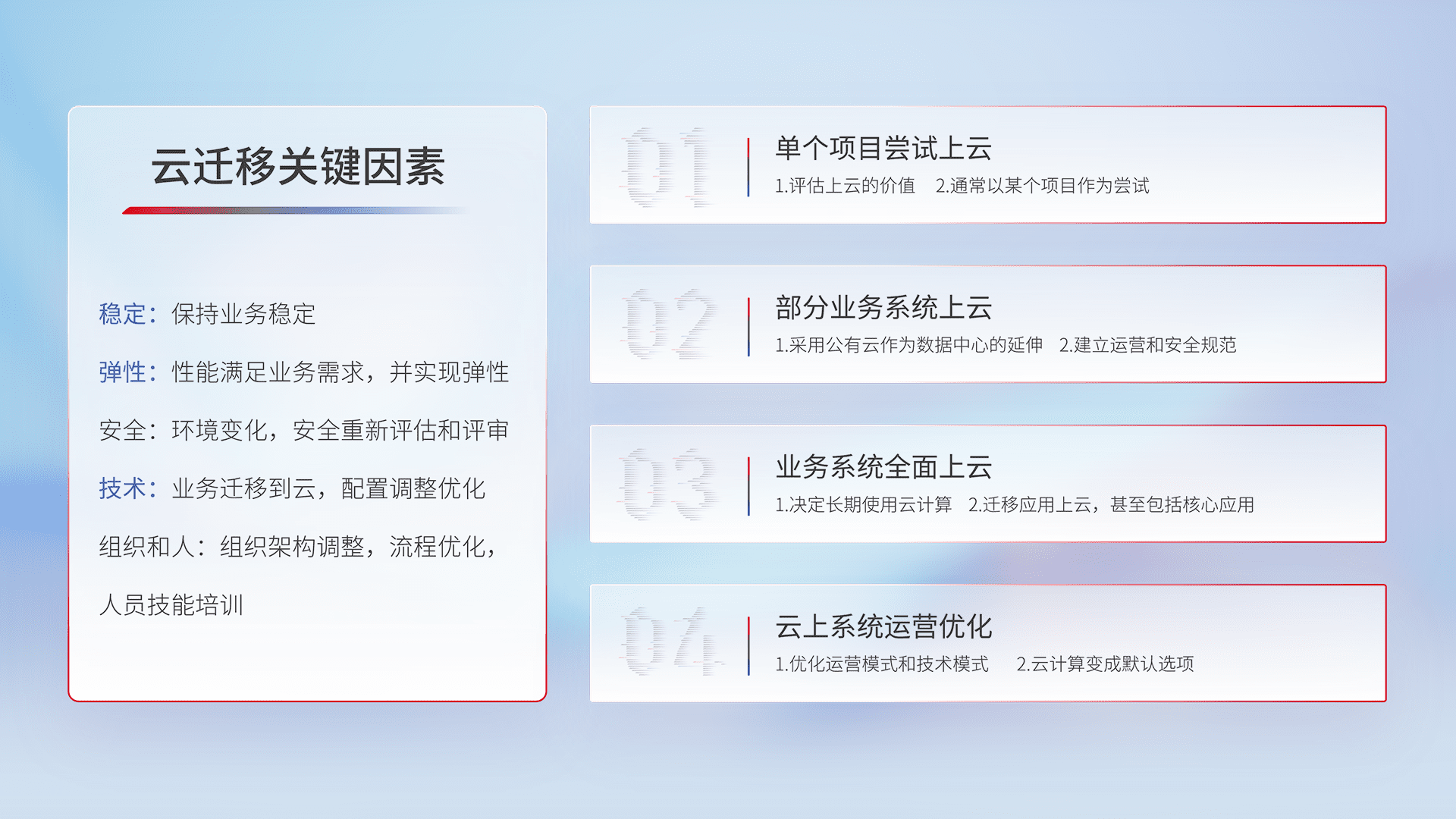 结合实际业务,,,从规划设计、、云平台选型、、、云原生改造、、数据迁移、、、、集成交付,,迁移全过程为客户识别最佳上云路径,,,,做好风险识别管理,,,设计网络架构、、、、身份权限、、、、安全审计合规、、操作审计、、、日志审计、、监控告警策略、、多站点容灾设计等,,,对云上基础设施进行整体规划,,提升IT治理水平,,,,以满足弹性、、、、高可用、、、、高性能的需求。。